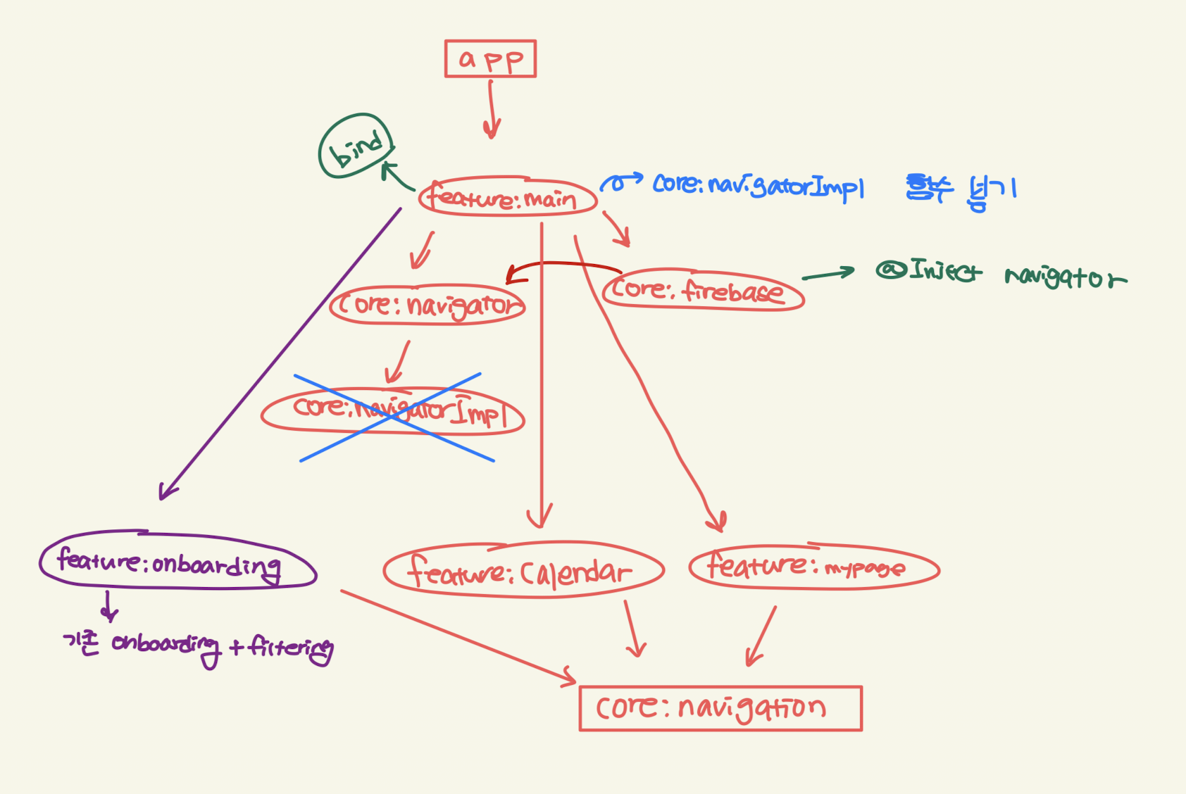 따라서 Navigator 모듈에 MainActivity 호출용 인터페이스를 두고, 구현체는 Main 모듈에서 DI로 제공한 뒤 Firebase 모듈이 그 인터페이스를 주입받아 MainActivity를 실행하도록 구조를 재설계했습니다.