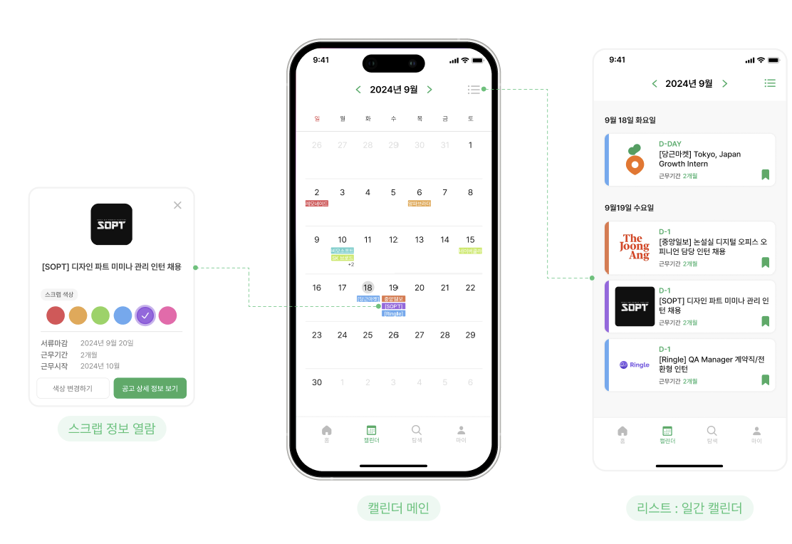 내 기준에 따라 다른 색깔로 공고를 스크랩할 수 있고, 앱 내 캘린더에서 통합된 관리를 경험할 수 있어요.