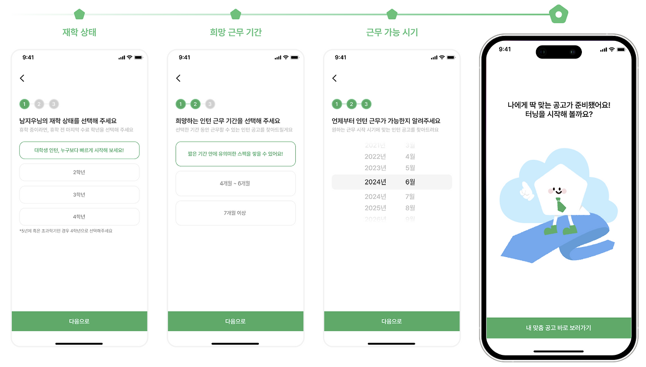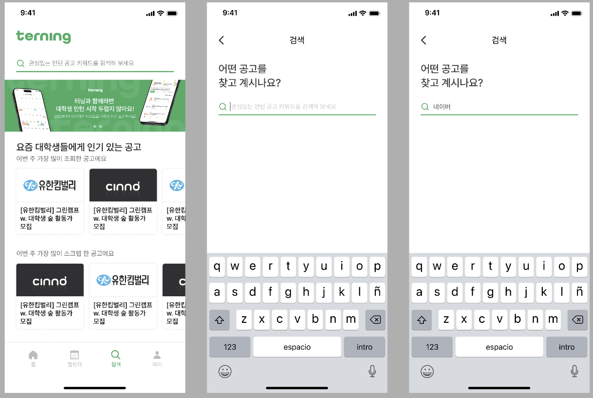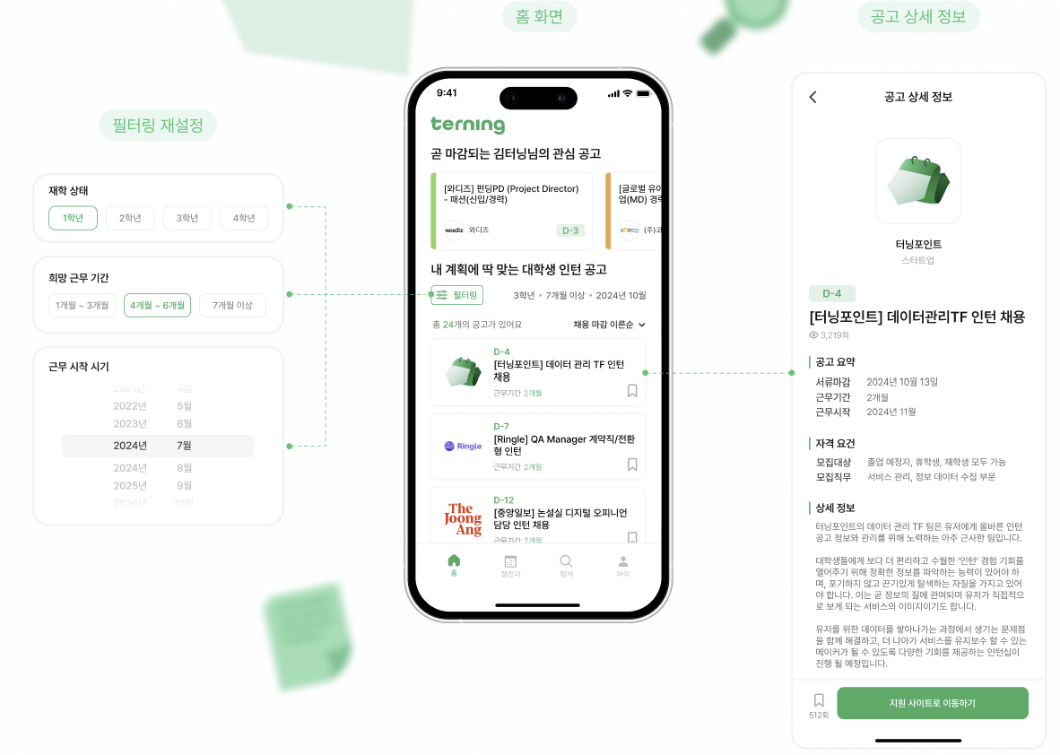 3. 다른 플랫폼을 통해 일정을 관리하지 않아도, 터닝 안에서 원큐에 인턴 공고 탐색부터 일정 관리까지 진행할 수 있어야 함
