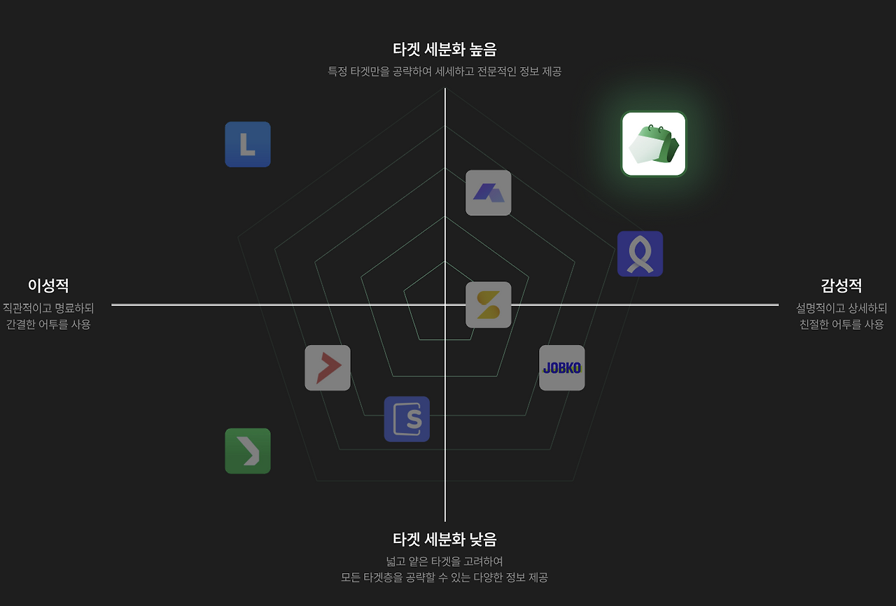 다른 채용 플랫폼 대비 타겟층은 '대학생'으로 세분화하여 보다 맞춤형 서비스를 제공하며,